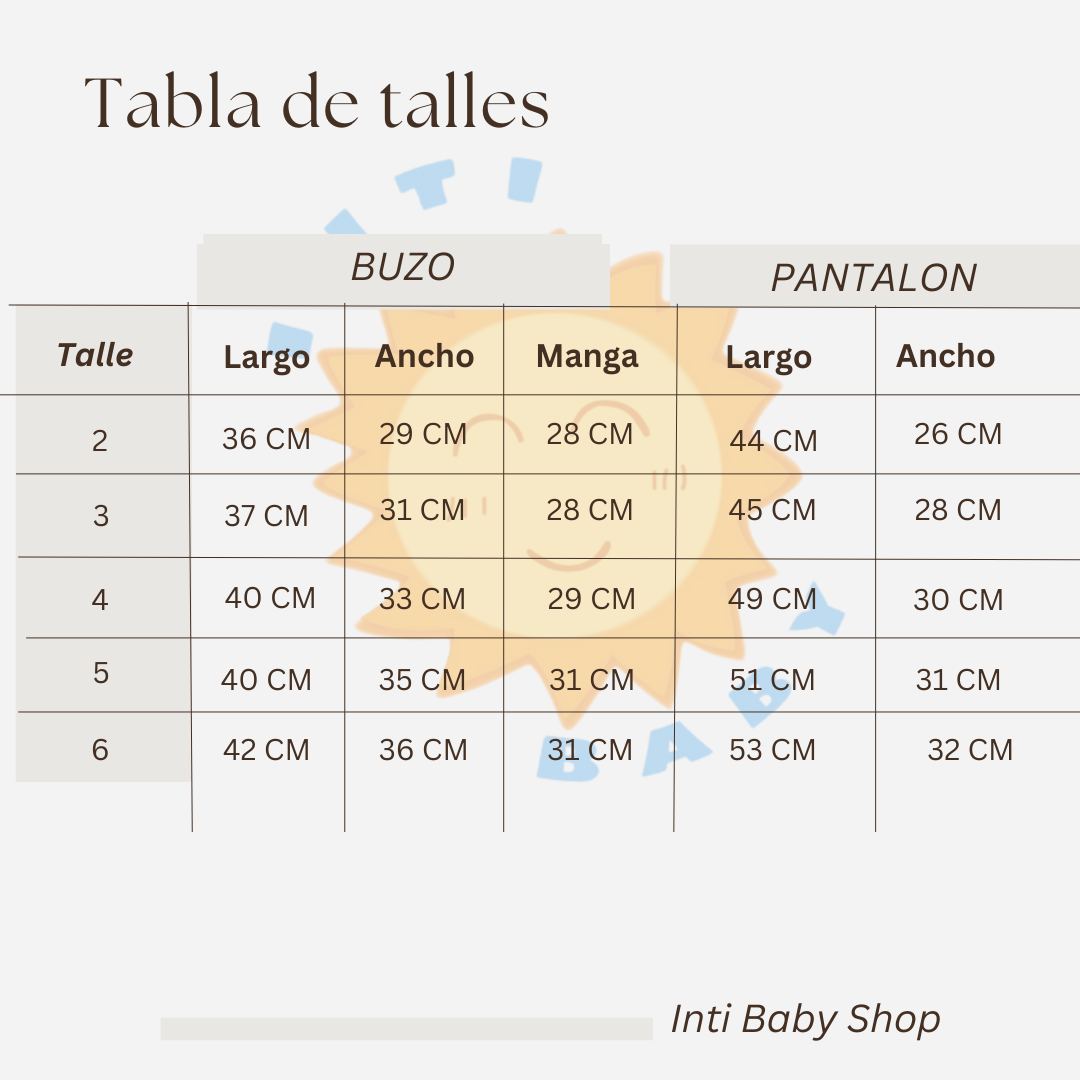 El pantalón cuenta con un elastico ideal para que se ajuste a tu bebé y con un estampa delicada y canchera. El buzo cuenta con puños y frisa de excelente calidad y súper suave. Son sueltos para una mejor comodidad.